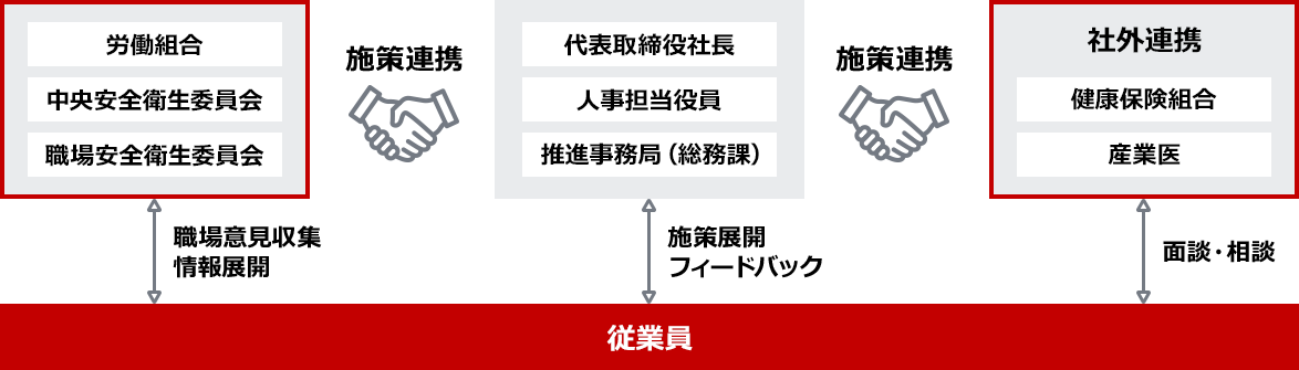 推進にあたっては、推進事務局、安全衛生委員会を通じて各種健康施策の展開を図ります。